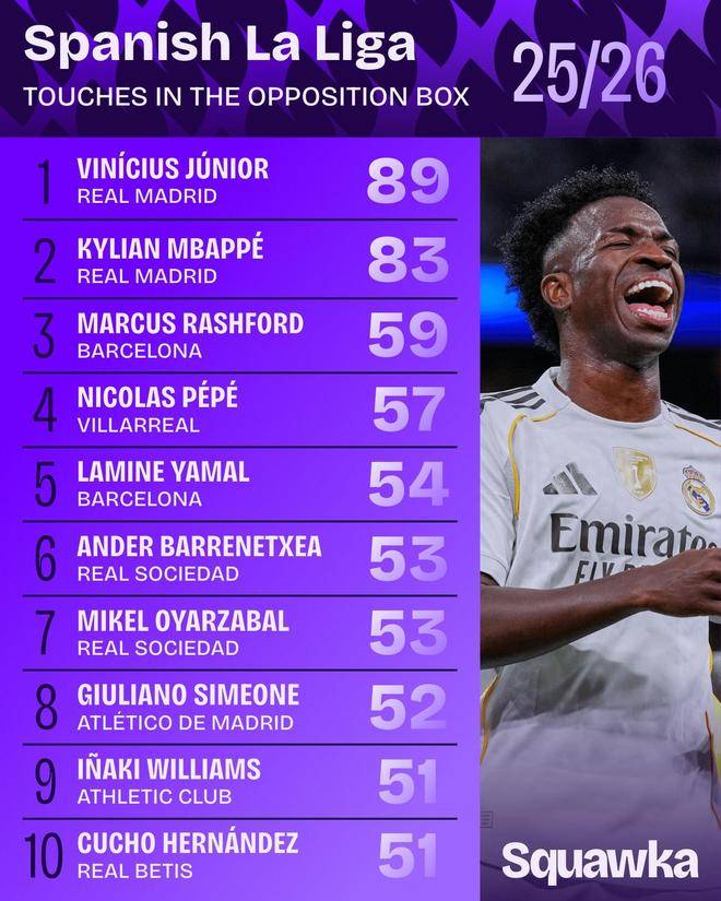 本赛季西甲对方禁区内触球次数最多榜:维尼修斯89次领跑榜单
